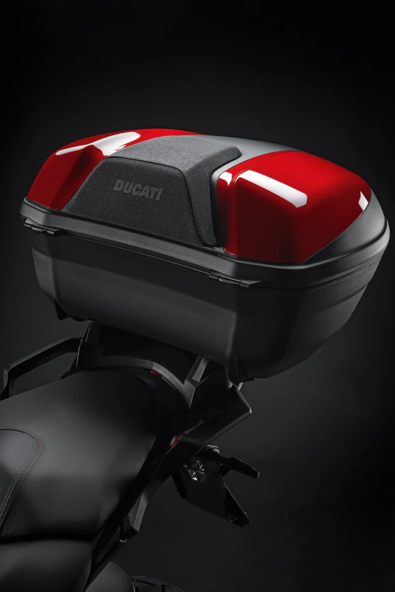 Integrisan quick release sistem. Zapremina od 48 litara omogućava lako odlaganje dve integralne kacige. Može se personalizovati poklopcima u različitim bojama. Maksimalna praktičnost u dodatku jednostavnog, ali izražajnog dizajna, koji se savršeno uklapa u izgled modela Multistrada.